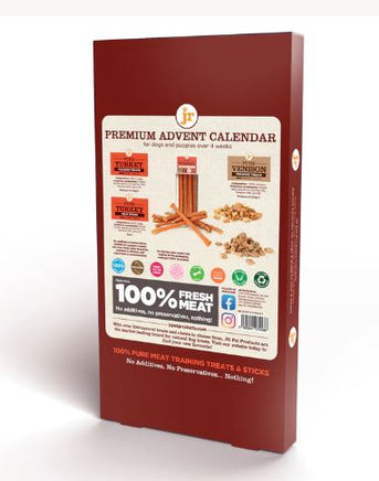 Treat your Dog to a fun and tasty Christmas Countdown with one of our 100% Pure Meat Advent Calendars. Our Red Edition is Hypoallergenic and is made up of traditional Venison and Turkey. Our Calendar includes our Pure Venison and Turkey Meat Training Treats alternated for days 1 to 24 and a whole pack of Turkey sticks for the perfect Christmas Day gift, all wrapped up in our 100% recyclable Christmas calendar outer.