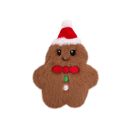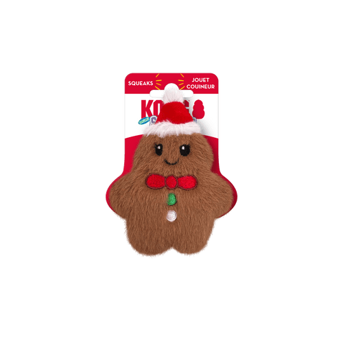 The KONG Holiday Snuzzles Mini Gingerbread is a delightful toy for small dogs that love big sounds! This plump, holiday-themed cookie features a full-body squeaker that encourages chewing and playful squishing. Its flat shape and soft, velvety plush exterior make it easy to carry, grab, and snuggle during the festive season.