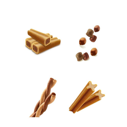 Includes 1x Pedigree Rodeo with Beef (4 pieces), 1x Pedigree Tasty Minis Chicken & Duck Flavour Chunks, 1x Pedigree Jumbone with Beef & Poultry and 1x Pedigree Dentastix Daily