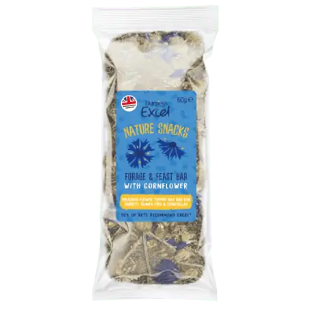 Your small animals will love our Excel Forage & Feast Hay Bar with Cornflower. Perfect for handfeeding to your rabbits, guinea pigs, or chinchillas, this tasty hay bar is made with natural ingredients and topped with delicious flowers.