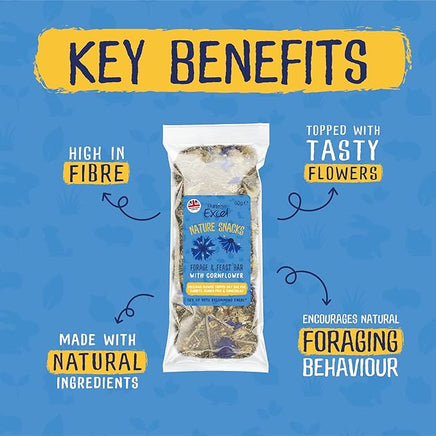 Timothy hay 92%, Cornflower 6%, raffia 1%, starch 1%.