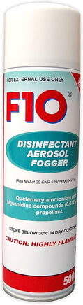 Simply place the canister in the room and activate the fogger for quick, easy and effective disinfection. The F10 disinfectant will be expelled and dissipate throughout the room within 5 minutes. Safe for re-entry after mist has settled – approximately 10 minutes. Use one canister per approximately 35 cubic meters of air space.