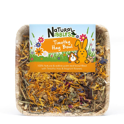 Natural Nibbles Timothy Hay Bowl comprises of a 100% edible palm leaf bowl filled to the brim with delicious timothy hay. It's then topped with a fantastic selection of dried flowers, including some bun favourites, like marigold and cornflower. Not only will your fluffy friend love the contents of this bowl but they will go crazy for the crunchy bowl itself!