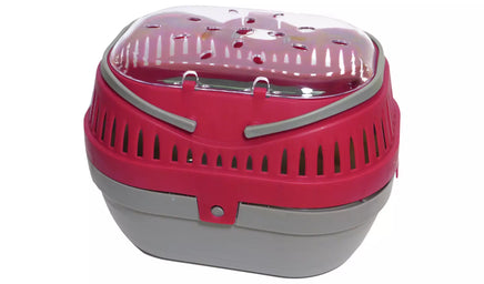 This plastic carrier is designed for the safe and secure transportation of your hamsters, mice and gerbils. It can also be used as a temporary home during cage cleaning. The top is clear and has airholes for ventilation.