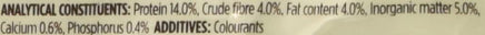 Protein 14.0%, Crude fibre 4.0%, Fat content 4.0%, Inorganic matter 5.0%, Calcium 0.6%, Phosphorus 0.4%
