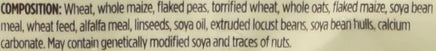 Extruded wheat, whole maize, flaked peas, toasted wheat, whole oats, flaked maize, soya bean meal, wheat feed, linseeds, alfalfa meal, soya oil, extruded locust beans, soya bean hulls