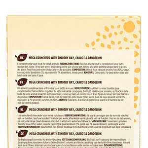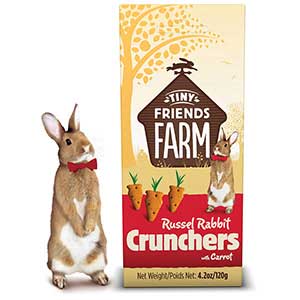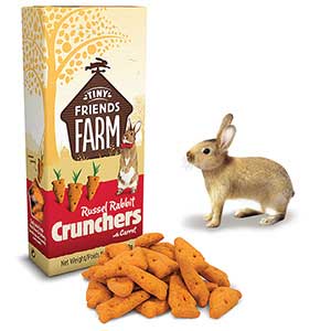 Tiny Friends Farm Russel Rabbit Small Animal Crunchers Treats with Carrot are tasty baked treats fresh from our bakery, made with the wholesome goodness of natural grains and tasty vegetables. Russel Rabbit Crunchers are perfect when you want to give your pet a tasty treat. They can be carefully hand fed to your pets, helping you to build those special moments together. One or two can also be hidden around your pet's enclosure to encourage natural foraging. And remember to give your rabbits lots and lots of fresh hay every day. Russel Rabbit Crunchers are also suitable for guinea pigs, chinchillas, hamsters, gerbils, mice and rats.