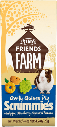 The Tiny Friends Farm Gerty Guinea Pig Scrummies with apple, strawberry, apricot and banana are tasty baked treats fresh from the bakery, made with the wholesome goodness of natural grains and real fruit.
