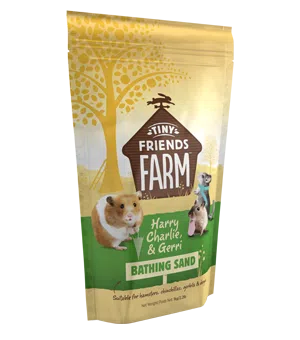 Allow 2.5cm/1″ of Tiny Friends Farm Bathing Sand in a high sided tray. Chinchillas will enjoy a sand bath every day, whilst hamsters, gerbils and degus prefer to bathe two or three times a week. Only allow your pet to bathe for up to 10-20 minutes at a time to help prevent dry skin. Remove soiled sand immediately and change the sand at least once a week.