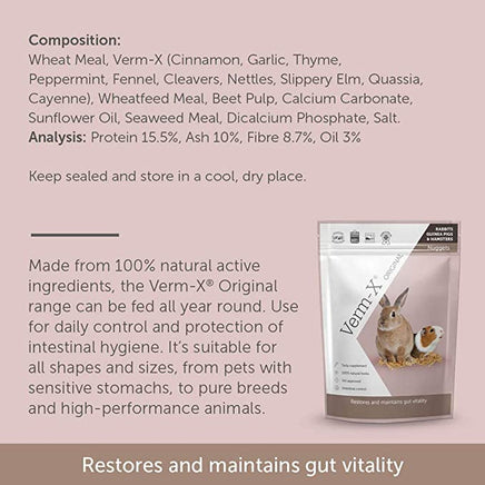 Wheat Meal, Verm-X (Cinnamon, Garlic, Thyme, Peppermint, Fennel, Cleavers, Nettles, Slippery Elm, Quassia, Cayenne), Wheatfeed Meal, Beet Pulp, Calcium Carbonate, Sunflower Oil, Seaweed Meal, Dicalcium Phosphate, Salt. Analysis: Protein 15.5%, Ash 10%, Fibre 8.7%, Oil 3%.