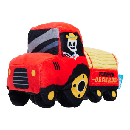 Watch out, pups! This ain't no ordinary autumn-mobile dog toy. Skeleton farmer, Oldest MacDonald is just dying to finish his chores and play with your pup. With two squeakers, crazy crinkle, and a tractor filled to the brim with fluff, his playtime work ethic screams: EEEK-I-EEEK-I-O! FEATURES: BARK Halloween undead farmer and tractor plush dog toy Two squeakers because one isn't enough. Packed with fluff for mouthfuls of fun. Crazy crinkle for a bite you can hear. Two squeakers because one isn't enough.