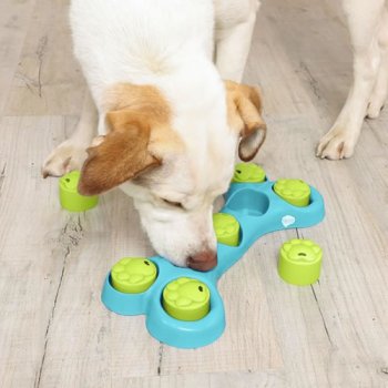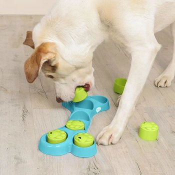 Remove cups to reveal treats inside! 7 independent chambers to hide your dogs treats. Features anti-slip pads at the base of the toy. Our Bone Hide IQ Toy is perfect for beginners, use your pets favourite, smelliest treat to get them excited to play and learn! Can also be used during meal time to help engage dogs or slow down eating.