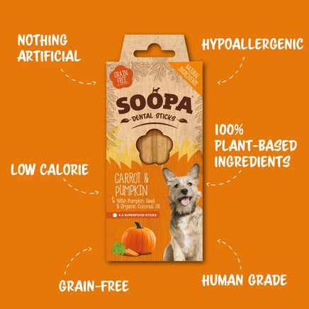 Soopa Dental Sticks are a hypoallergenic grain-free treat for the dog that loves to chew. Made using natural human-grade ingredients they help keep teeth clean and improve doggie breath. These sticks are bursting with vitamins & minerals and health benefits. Simple, delicious, nutritious and best of all dogs LOVE them!