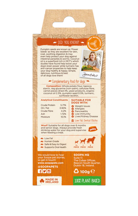 Pumpkin seeds are known as ‘Power Seeds’ as they are excellent for skin, coat, and soothing digestion and may even help protect your dog against intestinal parasites and worms. Coconut oil is a superfood rich in MCT’s which studies have found to help boost your dog’s brain power while turmeric has anti-cancer properties to help keep your dog healthy and happy.