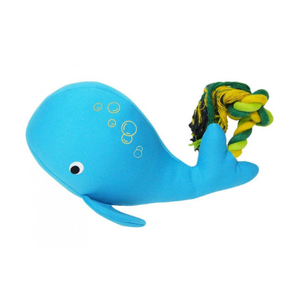 In the water, a floating toy for dogs is a dolphin.