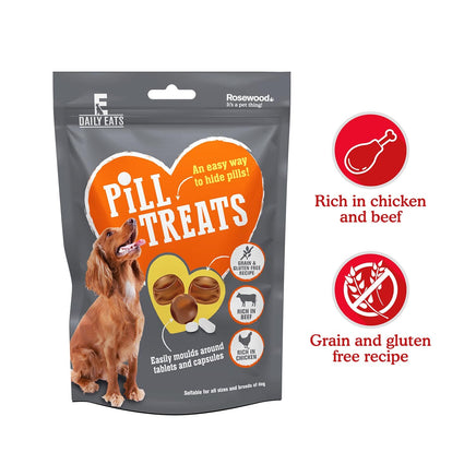 Turn pill time into treat time with these Rosewood Daily Eats Pill Treats. The stress-free way to give your dog their medicine, simply press the pill into the treat and mould it into a ball. These tempting treats are rich in both chicken and beef, making them the ultimate tasty treat and they're free from grain and gluten to keep sensitive tummies happy. Simply reseal the pouch with the easy reseal zip to maintain freshness.