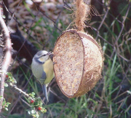 Natural coconut shell, filled with a high energy suet, selected seeds and dried Mealworms. Perfect for all year round feeding and 100% bio-degradable.